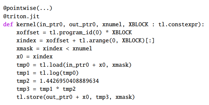 Triton codegen 负责将 TorchInductor 的 IR 映射到 Triton 核函数。下图显示了上述 log2 示例生成的代码。
